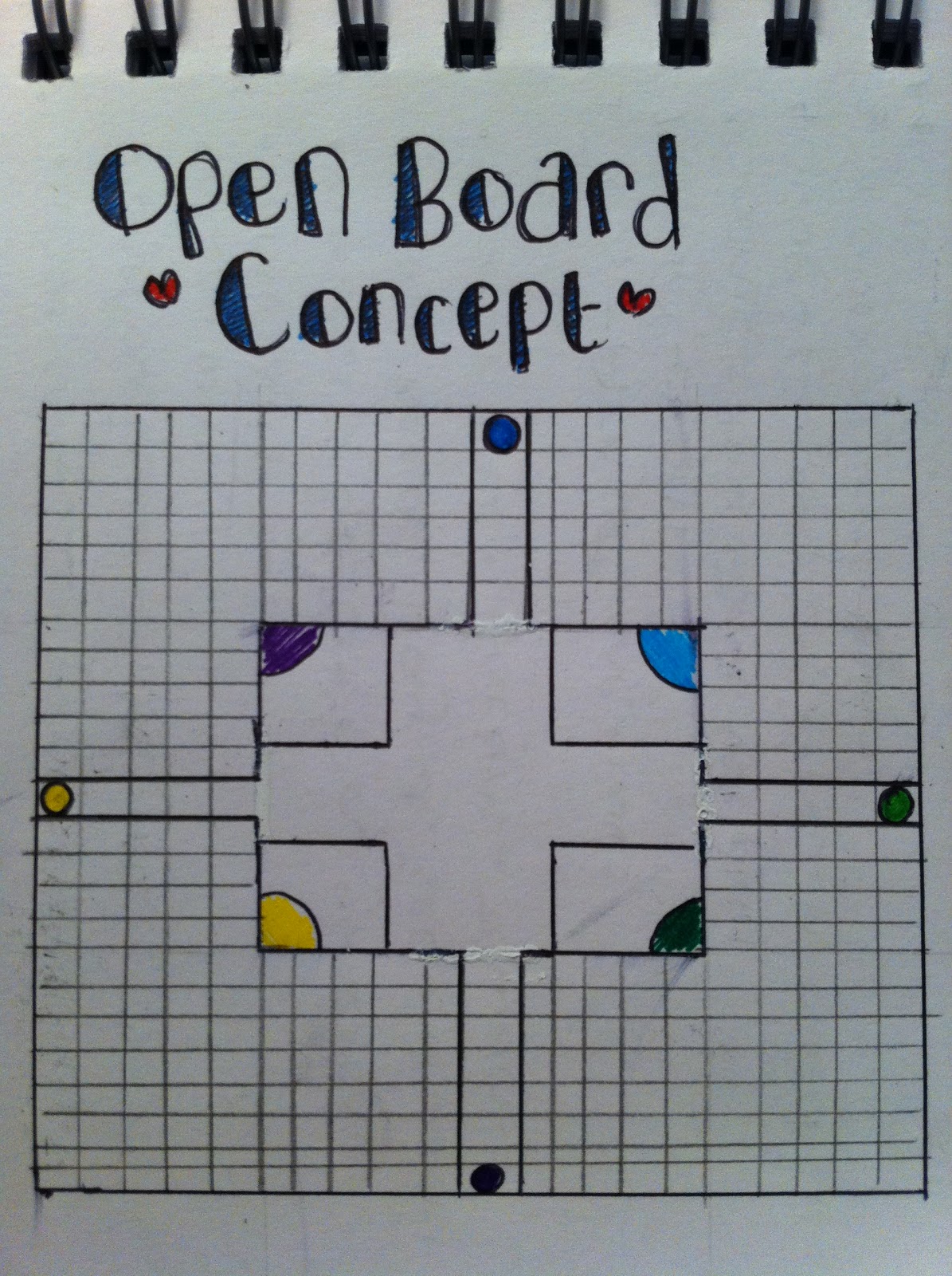 We have allocated a team member the job of designing and making the board itself. However, when we were unsure as to what our game was even going to be, we had alot of different concepts flying around. I decided to try and mock them up on paper, either mashing good ideas together or taking 1 good idea and drawing it. Here they are...